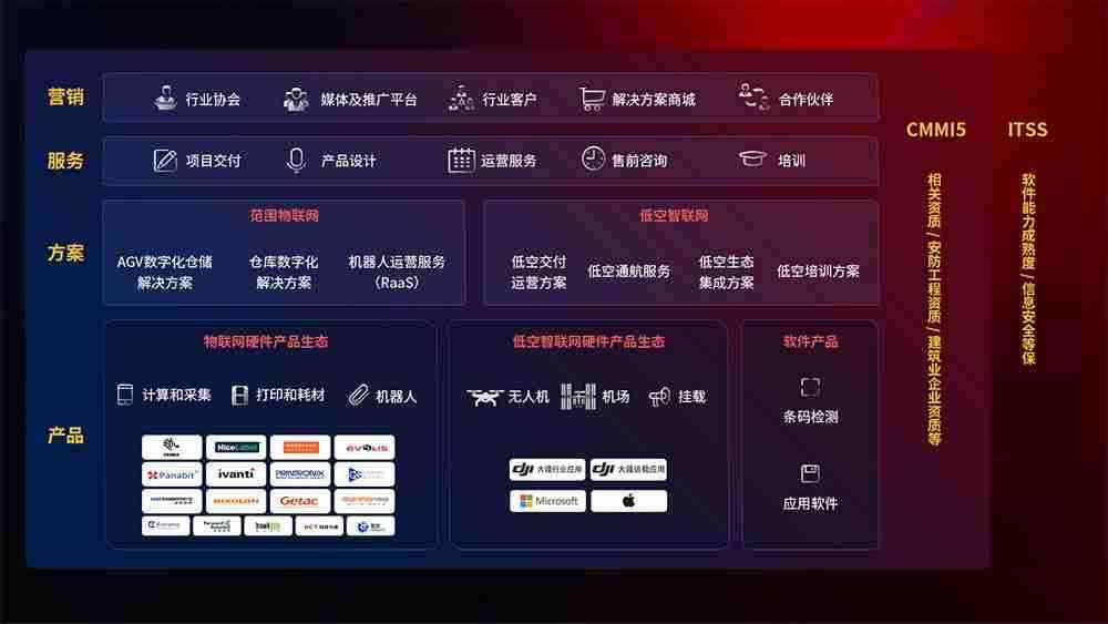 聚合国内外先进的物联网硬件产品品牌,,,,聚焦数字化仓储、、、机器人运营、、、、低空智联网等领域,,,共同打造适合客户业务场景的解决方案并提供交付服务